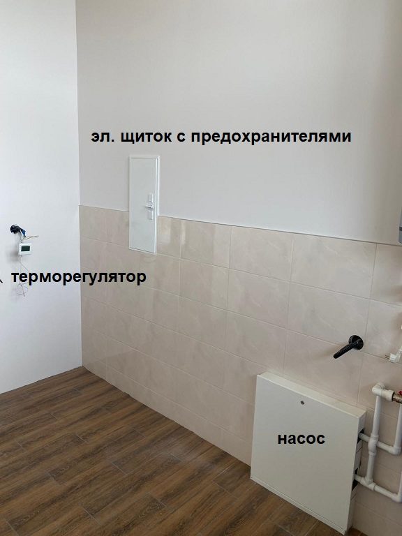 Дом обогревается теплыми полами (нагревательный кабель матрасного типа общей мощностью 9,5 кВт, производство Южной Кореи), которые поддерживают заданную температуру воздуха с помощью терморегуляторов.