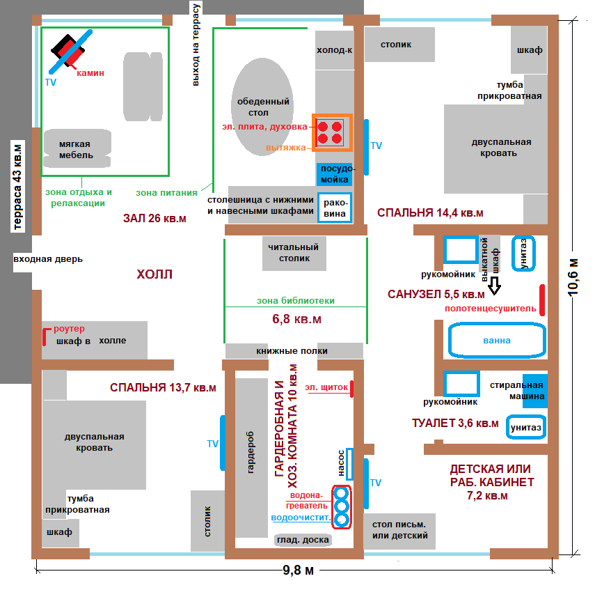 Например, в середине просторного коридора запланирована библиотека с книжными полками и читальным столом (см. планировку).